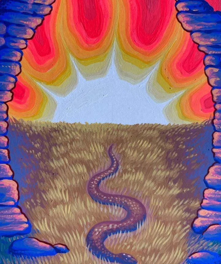 Here’s my initial pencil sketch. Once I saw this more clearly like a surreal apparition, I felt like I could really start to build detail in the background and incorporate some more imagery that Jeremy had mentioned, like the burning tree and a well (the Melusine is also often associated with a sacred well) and using the Melusine’s head to create a sort of eclipse in front of the burning sun. I wanted the design of the creature to be a bit androgenous, and I was imagining something to the way the more abstract visions of angels would appear.